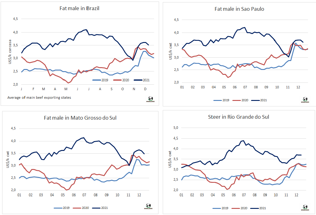 育肥牛價格本周全面下跌。主要原因是12月上半月國內(nèi)市場表現(xiàn)不佳,和無法出口中國。唯一牛價沒有下行的地區(qū)是南里奧格蘭德州,南馬托格羅索州和馬托格羅索州牛價有持續(xù)下跌,育肥牛價格較上周下跌了7-8雷亞爾/15公斤分別下跌至297.5雷亞爾/15公斤和291.5雷亞爾/15公斤。圣保羅州牛價下跌了4.5雷亞爾/15公斤,至308.5雷亞爾/15公斤。圣保羅州預(yù)定時間在8天左右,工廠的采購價格仍保持下行壓力。包裝工廠和分銷商的牛肉庫存都很大。