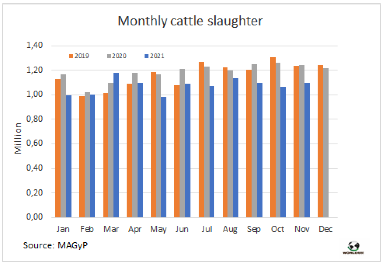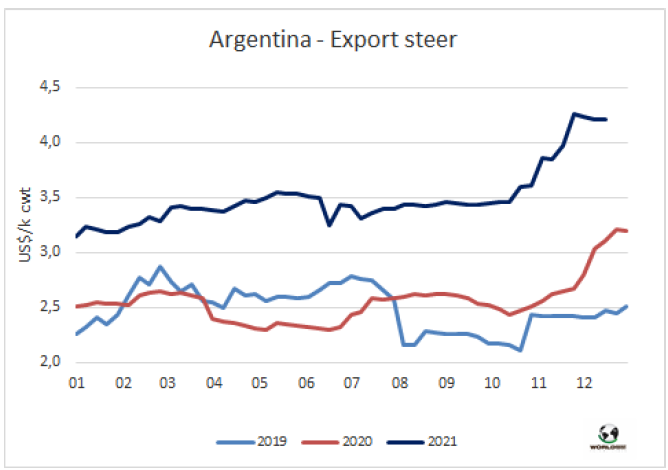 如果阿根廷政府宣布的牛肉出口政策得到確認(rèn)并全年實行,明年不含骨類的出口量將達(dá)79萬噸,預(yù)計較2021年增長11.3%,2021年全年出口量將達(dá)71萬噸。