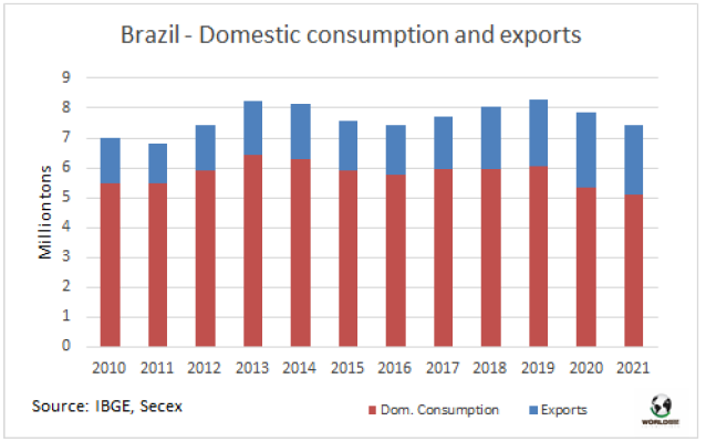 2021年巴西牛肉產(chǎn)量的減少對(duì)出口和國(guó)內(nèi)消費(fèi)均產(chǎn)生影響。據(jù)估計(jì),巴西去年人均牛肉消費(fèi)量509萬(wàn)噸(胴體重量),比2020年減少了27萬(wàn)噸(-5.1%),是自2009年以來(lái)的最低水平。這一數(shù)字是基于IBGE發(fā)布的生產(chǎn)數(shù)據(jù)和外貿(mào)部的對(duì)外貿(mào)易數(shù)據(jù)報(bào)告。相反,如果考慮到人口的變化,檢驗(yàn)機(jī)構(gòu)注冊(cè)的合規(guī)屠宰場(chǎng)(聯(lián)邦、州或市)生產(chǎn)的牛肉的人均消費(fèi)量是自2004年以來(lái)首次降至24公斤以下。由于暫停對(duì)中國(guó)出口,今年最后一個(gè)季度的出口量急劇下降,這意味著海外銷售較去年的下降比例要大于國(guó)內(nèi)市場(chǎng)。出口量減少了7.0%至234萬(wàn)噸,同比減少18萬(wàn)噸(胴體重量)。”