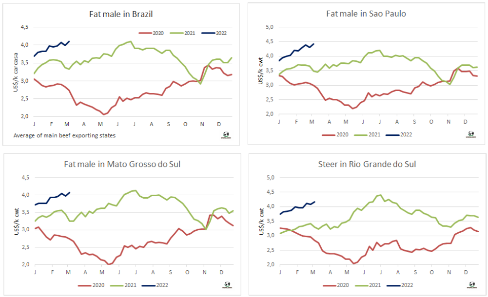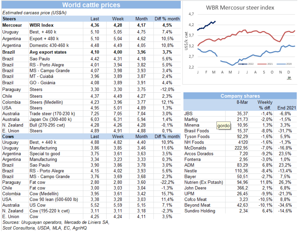 本周南方共同市場(chǎng)閹牛價(jià)格指數(shù)繼續(xù)8美分至4.36美元/公斤,創(chuàng)新紀(jì)錄。巴西烏拉圭阿根廷牛價(jià)均上漲,巴西育肥牛平均價(jià)格上漲主要原因是匯率走強(qiáng)和本地雷亞爾價(jià)格同步上漲,美金牛價(jià)較上周上漲了10美分至4.1美元/公斤。阿根廷和烏拉圭牛價(jià)達(dá)南美地區(qū)最高,也是歷史最高價(jià)格,本周出口閹牛參考價(jià)接近5.1美元/公斤,巴拉圭方面牛價(jià)趨勢(shì)相反,西方對(duì)俄羅斯的制裁限制了向這個(gè)國(guó)家銷(xiāo)售的可能性,巴拉圭受到了強(qiáng)烈的沖擊。