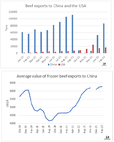 今年2月,中國(guó)采購(gòu)量在巴西的冷凍牛肉出口的占比為59%,在12月中旬貿(mào)易恢復(fù)后,中國(guó)迅速重新成為巴西的主要出口目的地。2月對(duì)中國(guó)牛肉出口量87087噸,較1月增加了66%。平均出口價(jià)格為6275美元/噸,環(huán)比略有上升。美國(guó)再次成為巴西出口商的第二大主要目的,巴西對(duì)美牛肉出口量16808噸,今年頭兩個(gè)月累計(jì)出口量3.15萬(wàn)噸。