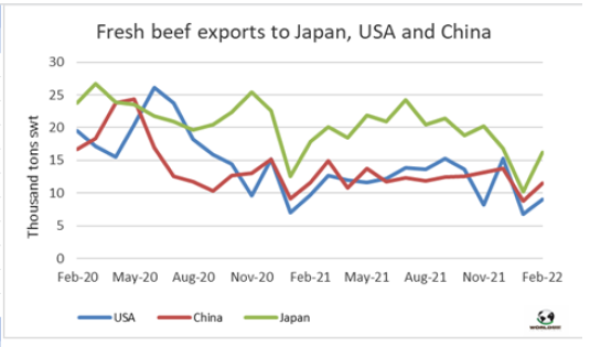 澳大利亞Beefcentral表示,2月澳大利亞牛肉出口總量?jī)H為59513噸,比去年同期已經(jīng)很低的66818噸下降了11%,比2017-21年2月份五年平均水平低28%。上個(gè)月,日本進(jìn)口的澳大利亞牛肉為16232噸,比去年同期(17878噸)減少了近10%,而中國(guó)進(jìn)口的澳大利亞牛肉為11531噸,較1月8780噸的低谷大幅增加,僅略低于去年2月(11676噸)。
