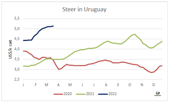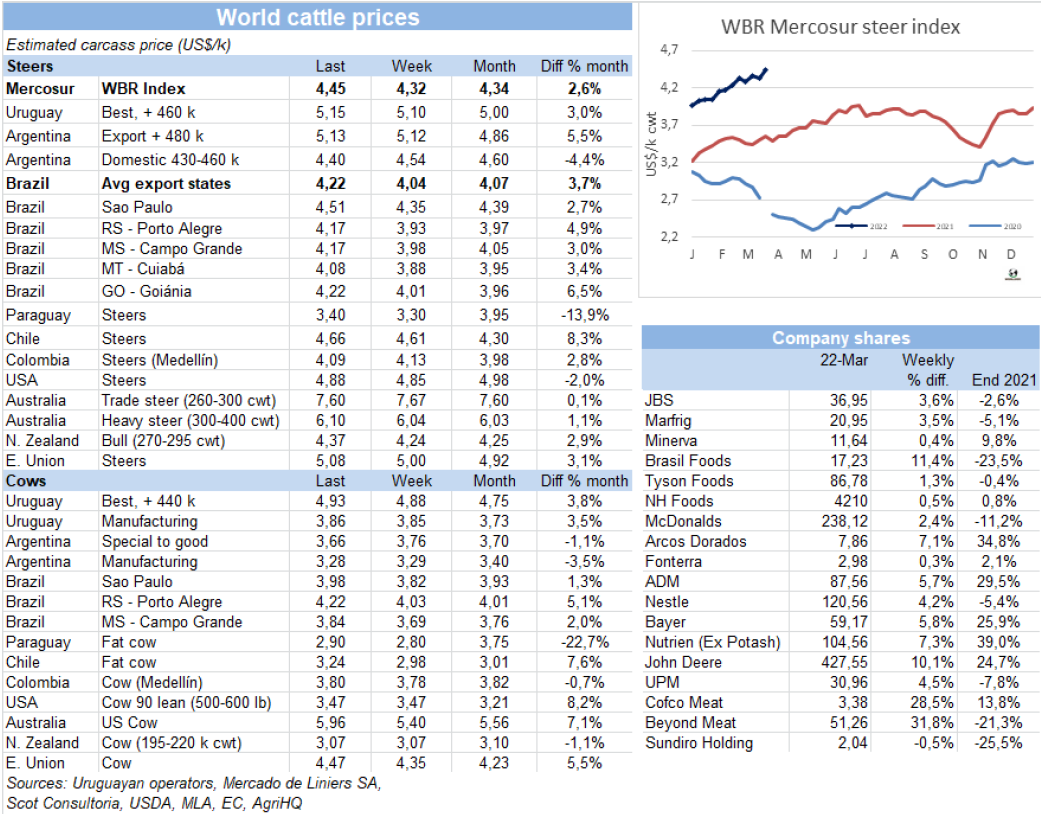 上周屠宰量創(chuàng)今年新高。烏拉圭肉協(xié)統(tǒng)計(jì)截止3月19日當(dāng)周牛屠宰量58287頭,較上周增加了6503頭,上周是因?yàn)槭艿酱笠?guī)模罷工的影響。較去年同期增加了僅500頭。所有種類牛屠宰量均有上漲。小母牛屠宰量增長最為明顯,約增長了21%至7143頭。母牛屠宰量增加了17%至22554頭,閹牛屠宰量增加了9%至27432頭。屠宰活動(dòng)最活躍的工廠是Marfrig Tacuarembo(7廠), 屠宰量5120頭。Las Piedras(379廠),屠宰量4798頭,Pando(439廠),屠宰,4455頭。Marfrig四家屠宰廠屠宰量15606頭,較上周上漲了3182頭,美麗華三家屠宰場屠宰量11791頭,較上周增加了554頭。3月前19個(gè)工作日牛屠宰量共計(jì)158267頭,較2021年同期增加了0.4%,母牛屠宰量增加了5.1%,閹牛屠宰量減少了3.7%, 2-4顆齒閹牛屠宰量增長了15.1%,占閹??偼涝琢康?span>60%。