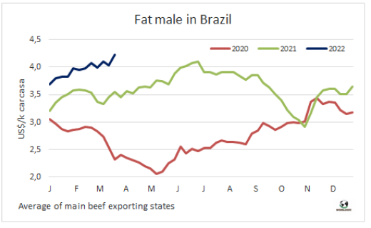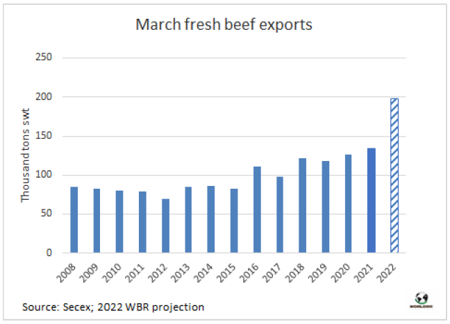 盡管上周牛肉出口速度有所下降,但3月有望成為歷史上巴西牛肉出口量最高的月份。如果在本月剩下的時(shí)間里保持這一勢頭,巴西的出口量將超過去年9月(18.7萬噸)的最大值,接近20萬噸。3月的前19天,巴西出口了121028噸牛肉,平均價(jià)格為5894美元/噸。這比2021年3月的出口量高出60%,而平均價(jià)格較上年增長27.8%。