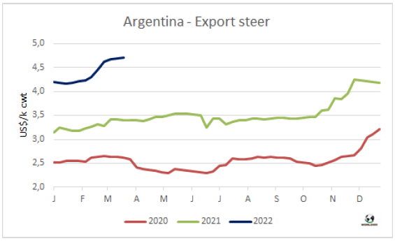 Ganadero信息中心主管、專家Ignacio Iriarte表示,阿根廷貧困人口的經(jīng)濟(jì)局限性和對牛肉出口的限制(匯率、出口稅、出口配額、向國內(nèi)市場提供補(bǔ)貼)未能阻止牛肉價(jià)格創(chuàng)1960年以來的最高記錄。在專家看來,盡管近幾個(gè)月來,活牛價(jià)格似乎已經(jīng)到了上限,“然后,供應(yīng)稀缺迫使出口商和消費(fèi)者支付更高的價(jià)格?!蹦壳盎钆9?yīng)不足,在很長一段時(shí)間內(nèi)也不會有所改善,無法滿足肉類加工廠的產(chǎn)能或強(qiáng)烈的海外市場需求。他還記得“2月每天的屠宰量比去年同期下降了7%;希爾頓的閹牛報(bào)價(jià)很低,沒有足夠的工業(yè)母牛滿足中國的需求,而體重較輕的犢牛、小母牛、閹牛的供應(yīng)非常低,反映了飼養(yǎng)場的嚴(yán)重危機(jī)”。此外,他還稱,在未來幾個(gè)月活牛的短缺肯定會加劇。