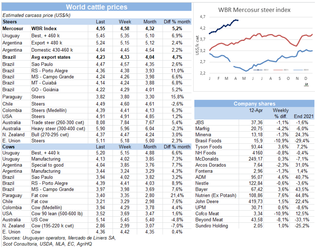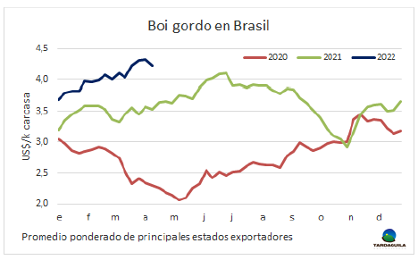 巴西牛肉出口平均價格持續(xù)上漲。 外貿(mào)部報告顯示,四月前六個工作日巴西牛肉出口量48148噸,平均價格6159美元/噸。平均單日出口量8025噸,較去年四月增長了28%。平均出口價格同比增長了29%,較今年3月增長了22%。近幾周巴西對中國出口價格下降,我們將看到出口平均價格下降。