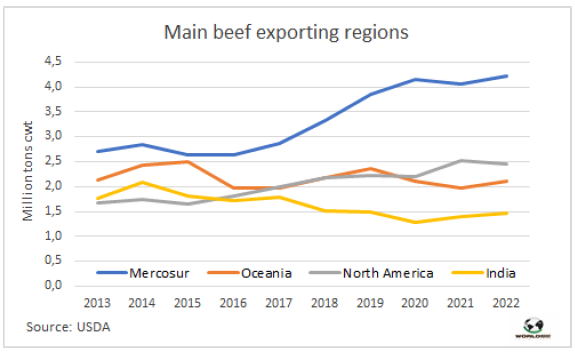 據(jù)美國農(nóng)業(yè)部上周發(fā)布的預(yù)測報告,今年南方共同市場牛肉出口量將上漲4%至421萬噸。南美地區(qū)出口量創(chuàng)新紀(jì)錄,保持世界最大的牛肉蛋白供應(yīng)商的地位。南方共同市場出口量的增長將歸因于巴西出口量同比顯著增長,增幅12%(約28萬噸胴體重),其他三個區(qū)域合作伙伴的出口減少所抵消。相反,由于美國和加拿大的產(chǎn)量減少,預(yù)計今年北美的出口量將減少6.7萬噸(-3%)。在第三大主要出口地區(qū)澳洲出口量預(yù)計將持續(xù)增加13.7萬噸至211萬噸,比2021年增加7%。增長的原因是澳大利亞育肥條件改善,活牛數(shù)量在2021年達到峰值,牛群存欄重建階段結(jié)束。