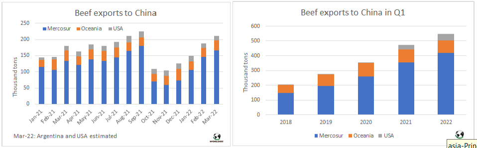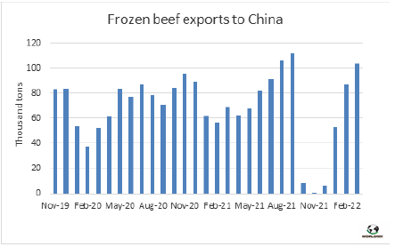 三月主要出口國對中國市場牛肉出口量超20萬噸,僅在去年八月和九月出口量超過該數(shù)量。巴西的發(fā)運量強勁是主要原因,從烏拉圭、澳洲的發(fā)運量也很大。2022年第一季度,向中國出口牛肉的全球主要牛肉供應(yīng)國出貨量約為21.2萬噸,僅低于2021年9月的紀(jì)錄。出口量同比增長16%(約7.6萬噸)。