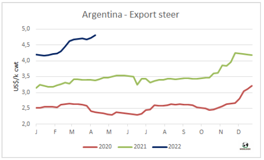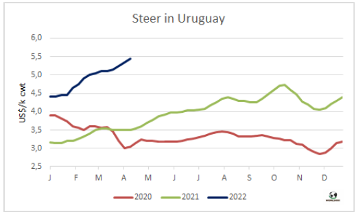 供應(yīng)短缺和價格普遍上漲繼續(xù)推高出口閹牛價格。上周牛價上漲了10-15比索,自今年年初以來,累計上漲了90-110比索。英國純種閹牛參考價530-545比索之間,比今年年初上漲了25%,而瘤牛雜交品種的價格上漲到490-510比索/公斤,今年迄今為止上漲了21%。特優(yōu)母牛供應(yīng)稀缺,上周價格上漲了20比索至460-480比索/公斤,與3個月前相比累計上漲了31%。主要賣到中國市場的工業(yè)母牛現(xiàn)在的價格約為420-430比索/公斤,比2022年初上漲了27%。