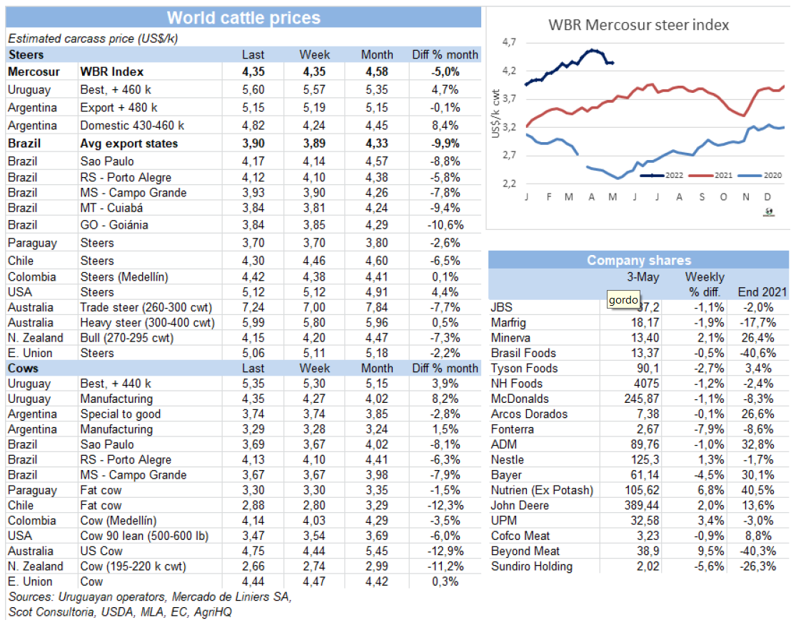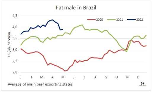 巴西育肥牛價(jià)格連續(xù)七周下跌后,市場(chǎng)達(dá)到了新的平衡。最近一周價(jià)格僅下跌了1雷亞爾/15公斤,主要出口州育肥牛價(jià)格參考價(jià)291雷亞爾/15公斤。需求方面,在周末母親節(jié)的額外需求的加持下,圣保羅批發(fā)市場(chǎng)銷售情況不錯(cuò)。草飼牛的供應(yīng)增長(zhǎng),給市場(chǎng)帶來了一些壓力,預(yù)計(jì)五月前兩周市場(chǎng)將保持穩(wěn)定。