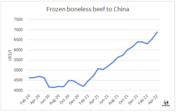 4月冰鮮牛肉對(duì)歐盟的平均出口價(jià)格達(dá)14179美元/噸,環(huán)比上漲了12%,達(dá)自2011年11月10多年以來的最高水平。這一平均價(jià)格反映了希爾頓配額內(nèi)的產(chǎn)品價(jià)格漲幅較大,而481配額內(nèi)出貨的產(chǎn)品漲幅相對(duì)緩和,占比小,平均價(jià)格較低。2022年前4個(gè)月,發(fā)往歐盟的冰鮮牛肉的平均價(jià)格為11893美元/噸,比2021年同期增長(zhǎng)了32%。