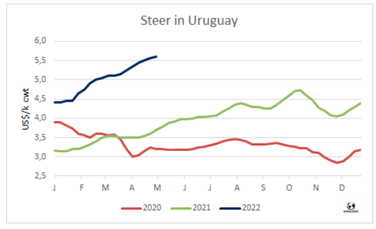 對(duì)巴拉圭來講智利進(jìn)口市場(chǎng)保持堅(jiān)挺,19切和20切全牛參考價(jià)6600-6700美元/噸,與7天前的市場(chǎng)相比變化不大。巴拉圭牛價(jià)穩(wěn)定,沒有必要給市場(chǎng)施壓。智利方面有對(duì)于美元價(jià)值上漲的擔(dān)憂,當(dāng)前1美元對(duì)850比索,最近一個(gè)月匯率上漲了9%,對(duì)進(jìn)口貿(mào)易不利。