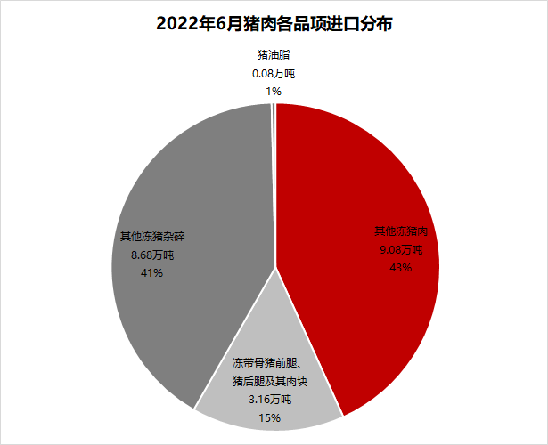 從進(jìn)口豬肉品項(xiàng)看,6月,其他凍豬肉進(jìn)口量9.08萬(wàn)噸,占比43%。其他凍豬雜碎進(jìn)口量8.68萬(wàn)噸,占比41%。主塊肉和脂肪的進(jìn)口量?jī)H占到16%。