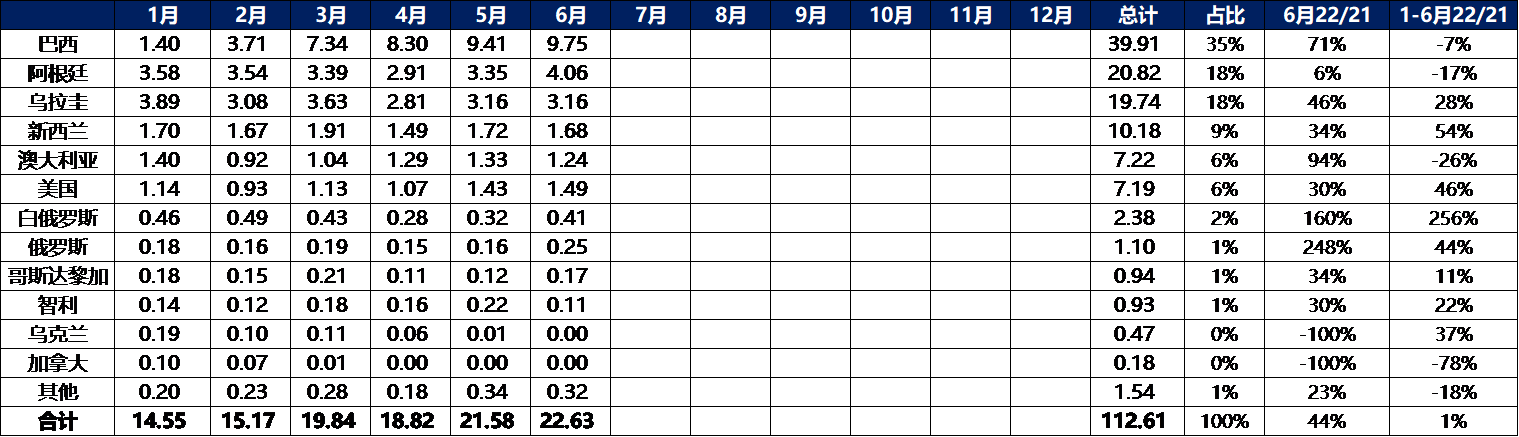 2022年6月中國(guó)主港牛肉進(jìn)口量22.63萬(wàn)噸,環(huán)比+4.9%,同比+44%。1-6月中國(guó)主港牛肉累計(jì)進(jìn)口量112.61萬(wàn)噸,與去年同期相比+1%。從進(jìn)口國(guó)別看,巴西仍然是最大進(jìn)口來(lái)源國(guó),從巴西進(jìn)口量占比達(dá)35%,前五大進(jìn)口來(lái)源國(guó)為巴西、阿根廷、烏拉圭、新西蘭、澳大利亞。