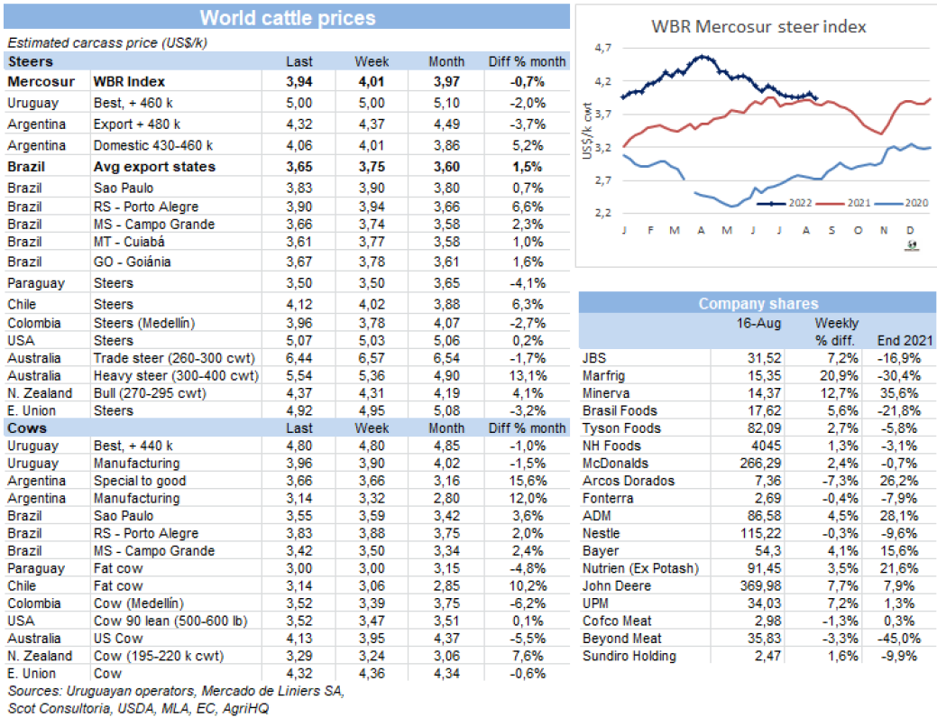 上周JBS六家屠宰廠暫停屠宰導(dǎo)致巴西活牛需求下降。南方共同股市場閹牛價格指數(shù)受此影響下降了7美分至3.94美元/公斤,達今年以來最低。受JBS屠宰場停工影響,巴西主要出口州育肥公牛價格下降了10美分至3.65美元/公斤。阿根廷出口閹牛比索價格保持穩(wěn)定,美金牛價下跌了5美分至4.32美元/公斤,包含9%出口稅。巴拉圭和烏拉圭參考價保持不變,分別為3.5美元/公斤和5美元/公斤。