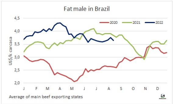 受周二JBS宣布關(guān)停6家屠宰工廠影響,上周待宰牛價格受重創(chuàng)。一些工廠突然降低采購價格,供應(yīng)增加,牛價下跌,預(yù)定時間拉長至13天,比上周提前了3天,十四年以來提前最久。平均來看雷亞爾牛價較上周下跌了6.5雷亞爾/15公斤,昨天圣保羅州育肥牛成交價295.5雷亞爾/15公斤,30天付款,下跌了4雷亞爾/15公斤。下跌最嚴重的是馬托格羅索州,下跌了10雷亞爾/15公斤。JBS暫停的屠宰工廠大部分集中在該州。受活牛期貨價格影響,現(xiàn)貨市場疲軟,本周10-11月船期合同成交價下跌了8雷亞爾/15公斤。下半月通常也會給批發(fā)市場牛肉價格帶來下行壓力,尤其是前部位肉價格。