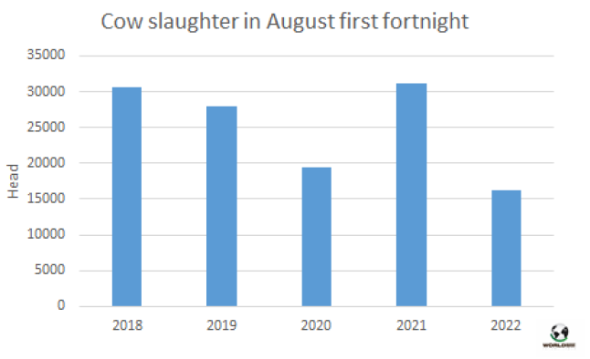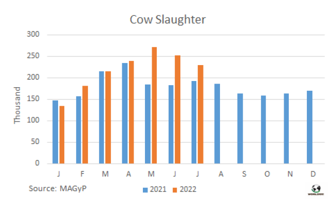 7月牛肉產(chǎn)量26.1萬噸,同比下降1.6%。7月人均消費量達45公斤/人/年,比一年前下降了5.4%。2022年到目前為止,由于平均屠宰重量的增加,牛肉產(chǎn)量已達180萬噸,比2021年同期增加了近4%。因此前7個月的人均消費量為46公斤/人/年。