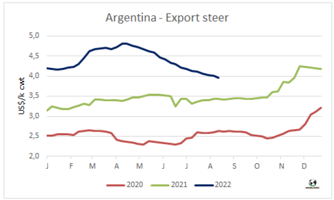八月前十個工作日巴西出口量持續(xù)較大,出口價格下降。巴西外貿(mào)部報告前十個工作日巴西牛肉出口量達88806噸,平均出口價格6284美元/噸,平均出口價格較七月下降了4%,較六月的最高點下降了8%。如果保持前兩周的出口節(jié)奏,八月巴西牛肉出口量將達20萬噸,較2021年八月增加超2萬噸,也將創(chuàng)歷年八月出口量最高記錄。