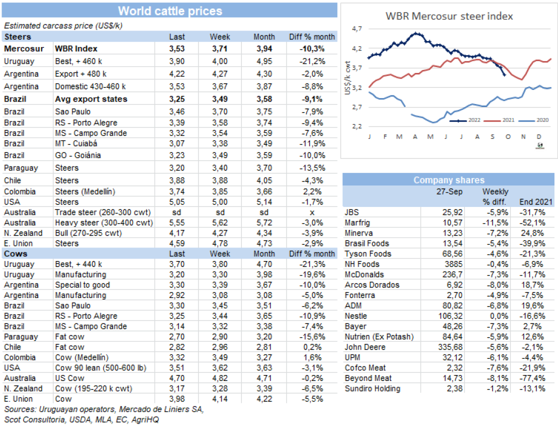本周牛屠宰量達(dá)6月14日至今14周以來最高。烏拉圭肉協(xié)報告,截止9月24日,一周內(nèi)牛屠宰量44394頭,較前一周增加了7000頭以上,增幅達(dá)19%。仍低于去年同期6353頭。上周屠宰活動低迷的三家工廠中,有2家恢復(fù)了屠宰活動,分別是美麗華8廠和MF394廠。MF仍然只有3家工廠在屠宰,55廠仍保持暫停。美麗華3廠仍暫停屠宰。本周母牛屠宰量較上周增加,增幅約45%,達(dá)15836頭。閹牛屠宰量增加了10%,至22913頭。本周屠宰量最活躍的工廠是439廠(4821頭),MF12廠(4705頭),379廠(4376頭)。Marfrig屠宰量12013頭,美麗華屠宰量7605頭。本周前24天牛屠宰量138619頭,較2021年同期下降了25%,預(yù)計9月牛屠宰量將達(dá)18萬頭,較2021年9月減少約5萬頭。