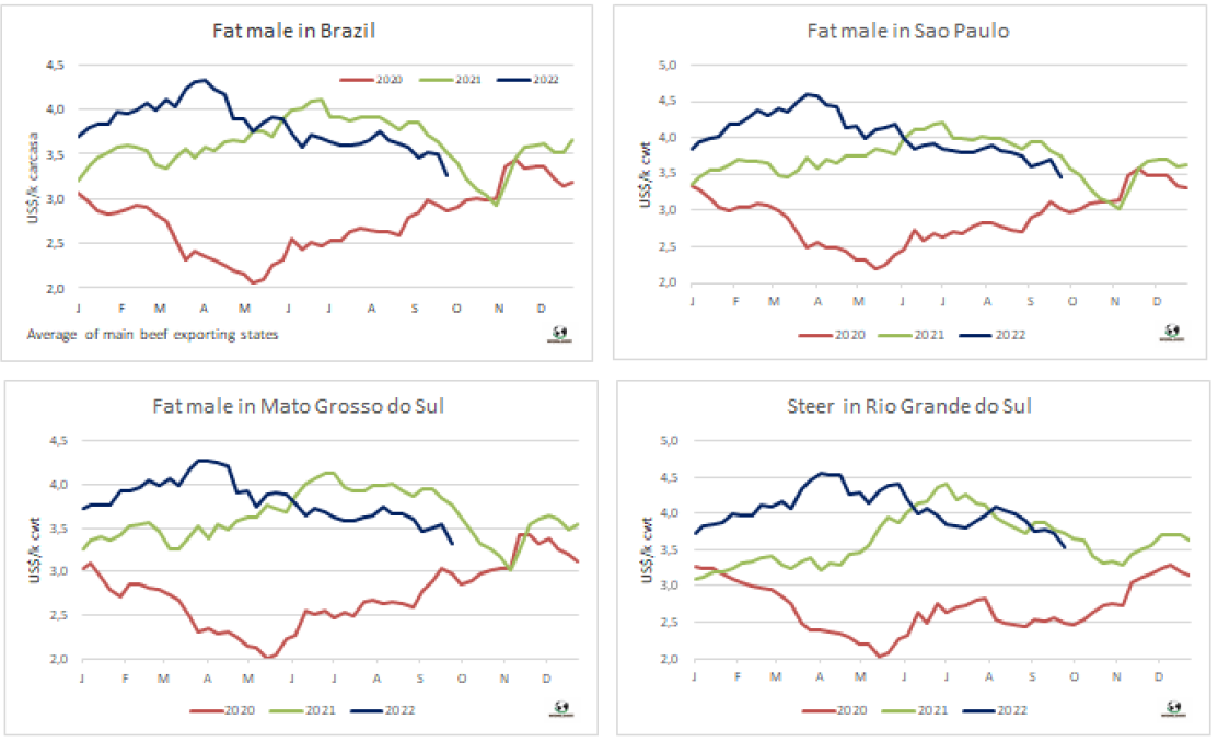 巴西待宰牛價格持續(xù)下跌。本周牛價下跌了5-6雷亞爾/15公斤。圣保羅市場,盡管主要供應(yīng)國內(nèi)市場的普通育肥牛數(shù)量也有下降,獲準(zhǔn)向中國出口的30個月以下的牛數(shù)量出現(xiàn)了更明顯的下降。昨天圣保羅市場育肥牛參考價279雷亞爾/15公斤,免稅,30天付款,較上周下跌了6.5雷亞爾/15公斤。批發(fā)市場牛肉價格持續(xù)疲軟,尤其是前部位肉價格。