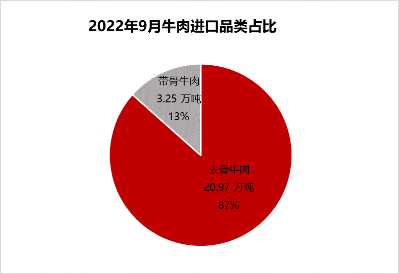 從進(jìn)口品類看,帶骨牛肉進(jìn)口量20.97萬(wàn)噸,占87%,去骨牛肉進(jìn)口量3.25萬(wàn)噸,占13%。