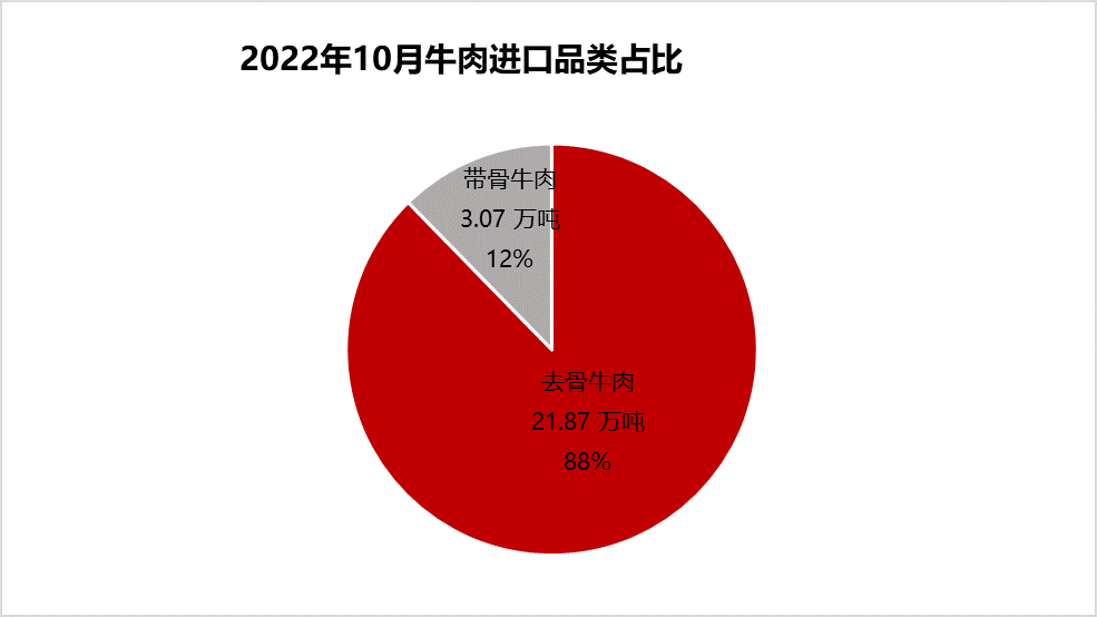 從進(jìn)口品項(xiàng)看,帶骨牛肉進(jìn)口量3.07萬噸,占比12%,去骨牛肉進(jìn)口量21.87萬噸,占88%。