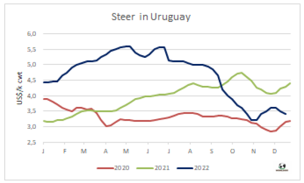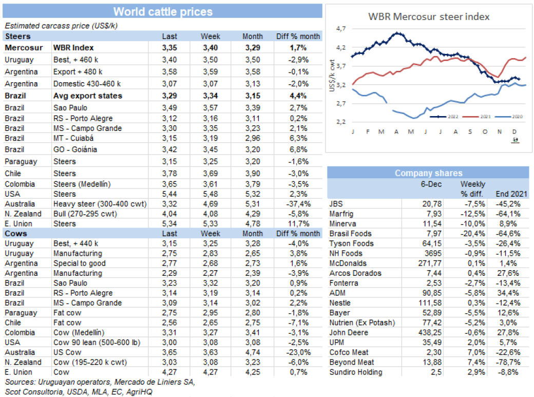 本周南方共同市場閹牛價格指數下跌了5美分,至3.35美元/公斤。巴西、巴拉圭、烏拉圭牛價走弱,阿根廷牛價保持穩(wěn)定。巴西主要出口州閹牛價格從上周的3.34美元/公斤下跌至3.29美元/公斤,且本周雷亞爾兌美元匯率調貶。