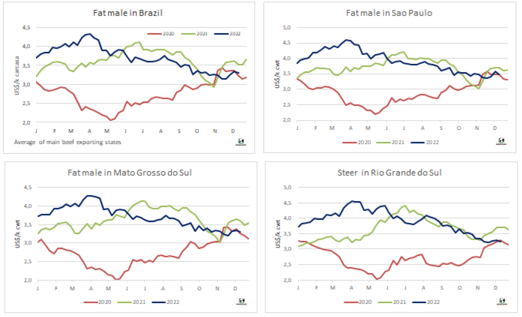 明年受中國需求減弱和供應增加的影響,圣保羅育肥牛價格將低于今年的水平。預計在250-270雷亞爾/15公斤之間波動。分析師稱,明年預計牛價持續(xù)堅挺,隨后價格會下跌?!耙恍┤苏J為牛價在頂部會趨于平穩(wěn),但事實并非如此。牛周期處于下行階段,2019-2021年期間生產端為提高生產能力進行了大量投資。明年年初牧草漲勢較好將幫助農民賣個好價錢,但分析師認為這種情況不會持續(xù)太久,屠宰端為了應對這種情況已經開始減產。原本幫助抵消國內市場消費下降的出口業(yè)務明年也不會出現2022年的出色表現,因為中國作為巴西牛肉的主要出口目的地對進口牛肉的依賴逐步減小。