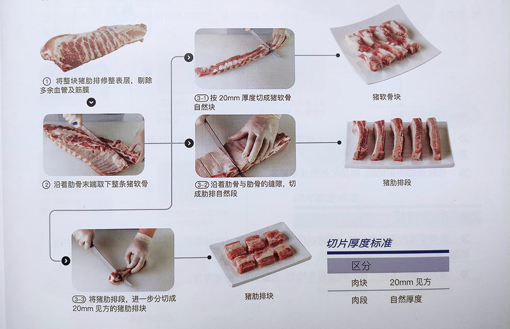 美國(guó)豬肉的谷飼飼養(yǎng)特性,基于菜式烹飪理念進(jìn)行分割,才可體現(xiàn)其多汁濃郁、鮮美回甜的特性。由于整扇肋排每個(gè)區(qū)域的帶肉率有所不同,所以在分切時(shí)需做到盡量每一份的均衡,避免客訴。
