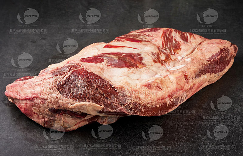 牛前胸肉(Brisket)是位于牛胸口兩肢前腿中間胸脯肉,一面是脂肪,一面是紅色精肉,是牛前腿上端部位的總稱。該部位肌肉通常被脂肪層覆蓋,且富含大量結(jié)締組織。