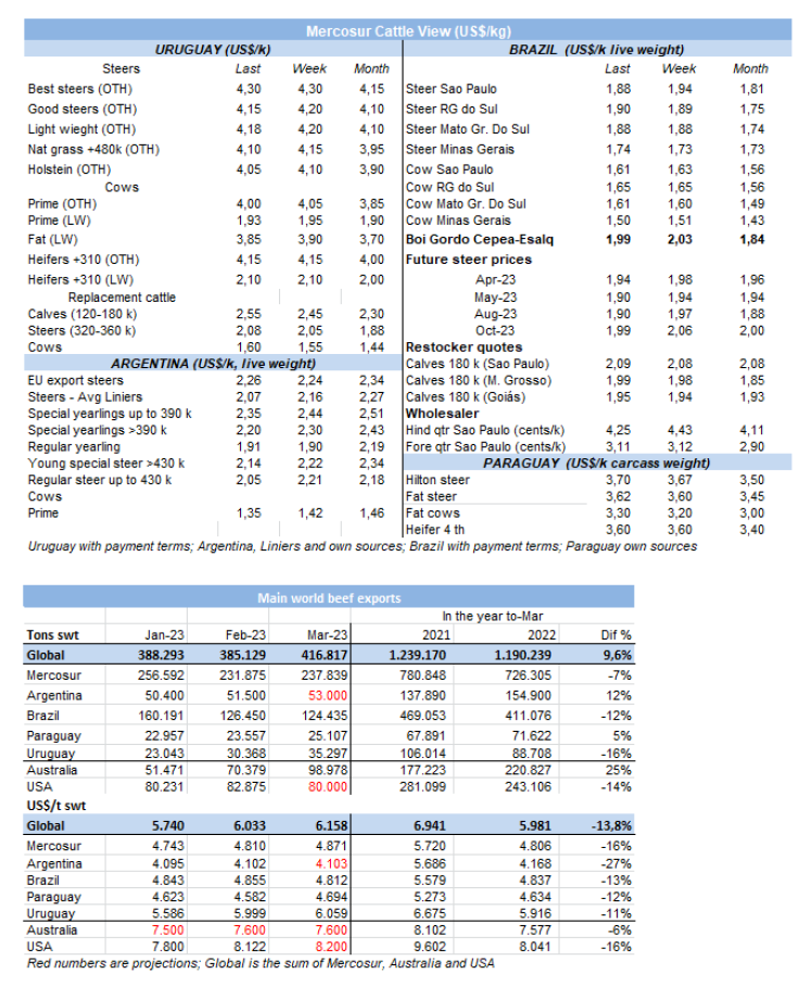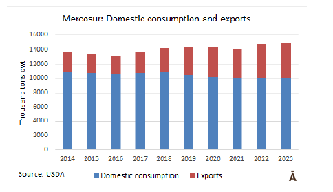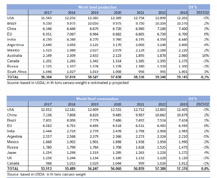 根據(jù)美國農(nóng)業(yè)部上周發(fā)布的預測,主要的牛肉出口商會保持其對國際市場的穩(wěn)定銷售量,一些國家的銷售量減少將被其他國家的增長銷量所抵消。三個主要出口國巴西、澳大利亞和印度將增加銷量,而其他國家(美國、阿根廷、烏拉圭、巴拉圭和新西蘭)將減少銷量,因此最終平均下來銷量與2022年非常相似。南方共同市場、大洋洲、北美和印度的總銷量約為1070萬噸,比去年增加6.7萬噸。