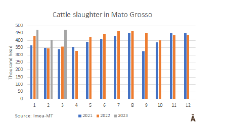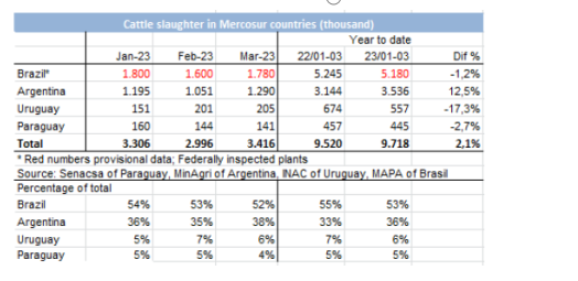 IMEA的數(shù)據(jù)顯示,馬托格羅索州的屠宰場在3月份屠宰了472.47萬頭牛,環(huán)比增長16.6%,同比增長32%。
