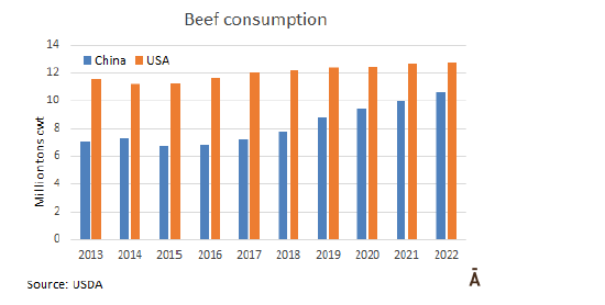 在過去八年中,中國牛肉消費量從680萬噸增長到1090萬噸,增長了60%。中國消費量快接近美國,而美國在此期間增長了10%,達到了1240萬噸。如果中國消費量的這種擴張趨勢繼續(xù)下去的話,在未來十年,中國將超過美國,不僅會成為世界主要的牛肉進口國,而且還會成為主要的消費國。根據(jù)美國農(nóng)業(yè)部的數(shù)據(jù)顯示,在2023年,中國的消費量比美國少150萬噸;而2015年的消費量則比美國少450萬噸。