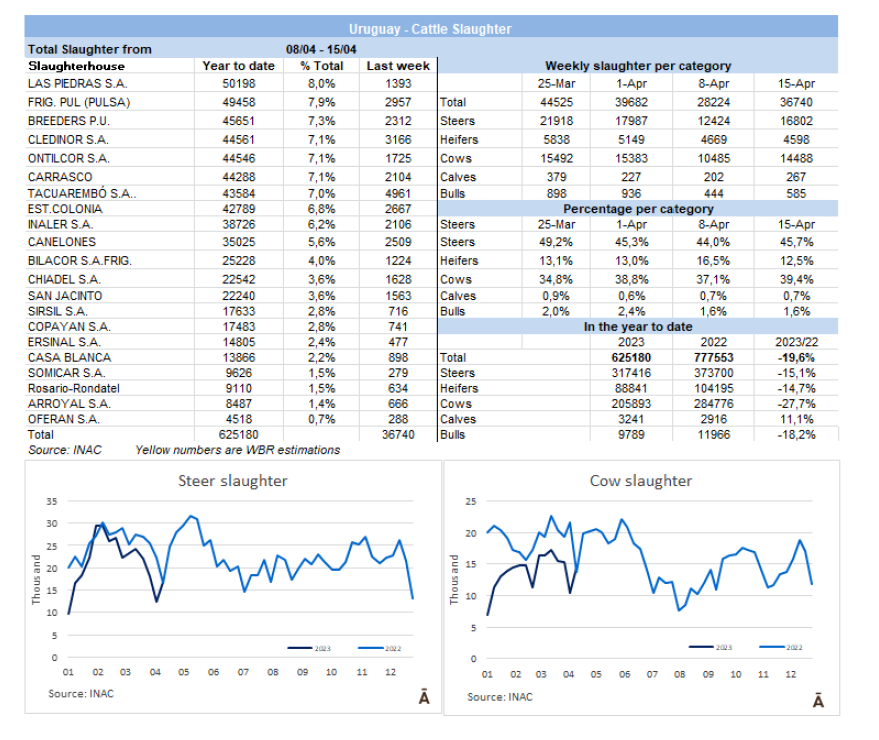INAC報告說,有36740頭牛進入工廠,其中16802頭是公牛(占總數(shù)的46%)和14488頭母牛(占總數(shù)的39%)。本周產(chǎn)量最高的工廠是Marfrig-Tacuarembó ,有4961頭牛在加工,遠遠超過Marfrig-Cledinor(3166頭)和Minerva-Pulsa(2957頭)。在這一周里,Marfrig屠宰了12900頭牛,Minerva屠宰了7570頭牛。4月上半月,屠宰了68019頭牛,比2022年同期減少了34%。