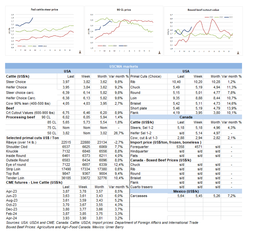 無論如何,價格沒有產(chǎn)生太大變化。前后腱$6800,板腱$5100,肋骨$5800,后部位肉$6000,80碎肉$3600。這些參考價格比3月底市場上的價格低約$100。一位實業(yè)家透露,鑒于最近幾周屠宰牛價格的上漲,他收到了中國出價$4000美金來收購一頭母牛四分體,并表示“這個價格讓人無法接受”。