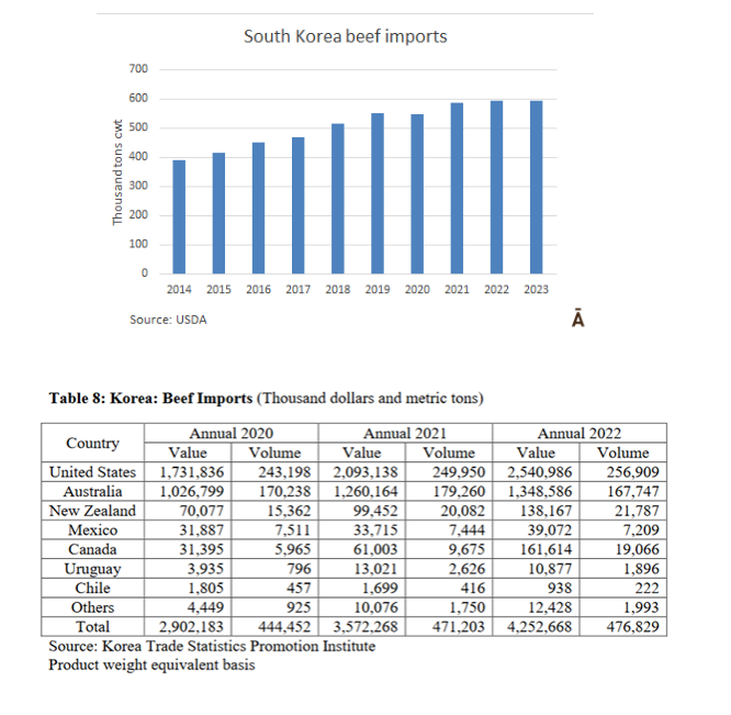 美國農(nóng)業(yè)部預計韓國2023年的牛肉進口量為59.5萬噸,與2022年持平,比1月份的預測量低1.5萬噸。國內供應將增加近40噸達到37.9萬噸。