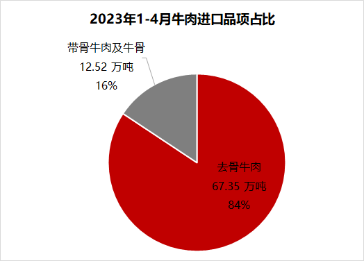 從進口品項看,去骨牛肉進口量67.35萬噸,占比84%,帶骨牛肉及牛骨進口量12.52萬噸,占比34%。