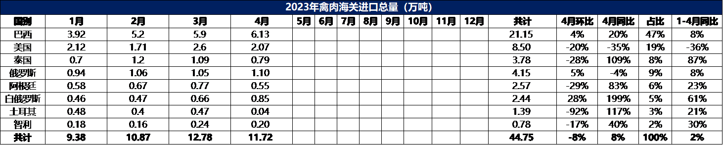 2023年4月冷凍禽肉進口數據