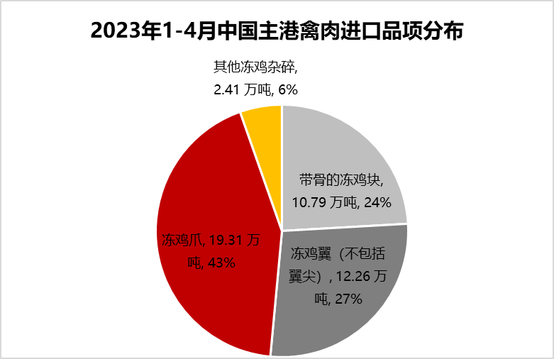 從進口品項看,凍雞爪進口量19.31萬噸,占比43%。凍雞翼(不包括翼尖)12.26萬噸,占比27%。