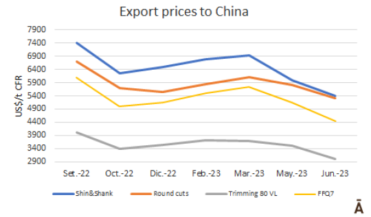 出口到中國(guó)的主要產(chǎn)品的參考價(jià)格比去年第四季度的最低價(jià)還要低5%-15%,相對(duì)而言帶骨產(chǎn)品價(jià)格則比較穩(wěn)定。