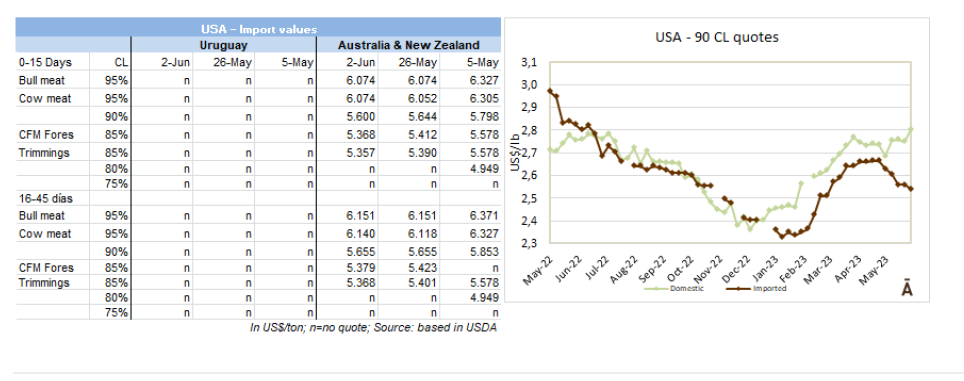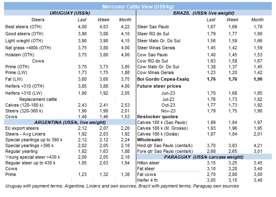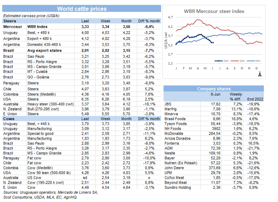 在烏拉圭和巴拉圭,價(jià)格趨勢(shì)是向下跌的,與低迷的國(guó)際環(huán)境一致。烏拉圭的閹公牛價(jià)格下降了3美分-4美元每公斤。