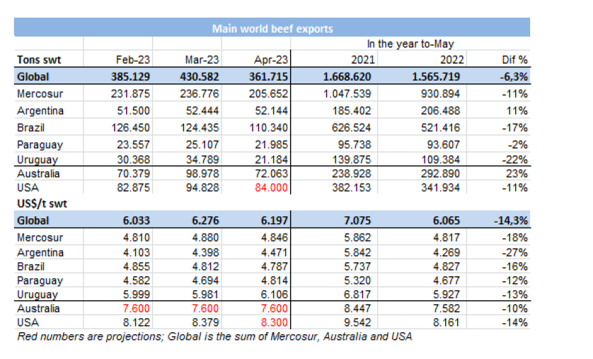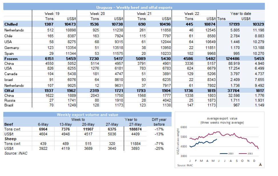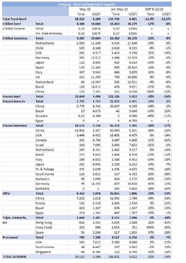 根據(jù)海關(guān)數(shù)據(jù),2023年1-5月,烏拉圭牛肉累計(jì)出口達(dá)13.8萬(wàn)噸,同比減少22%。均價(jià)同比降低了14%,至每噸$6001。