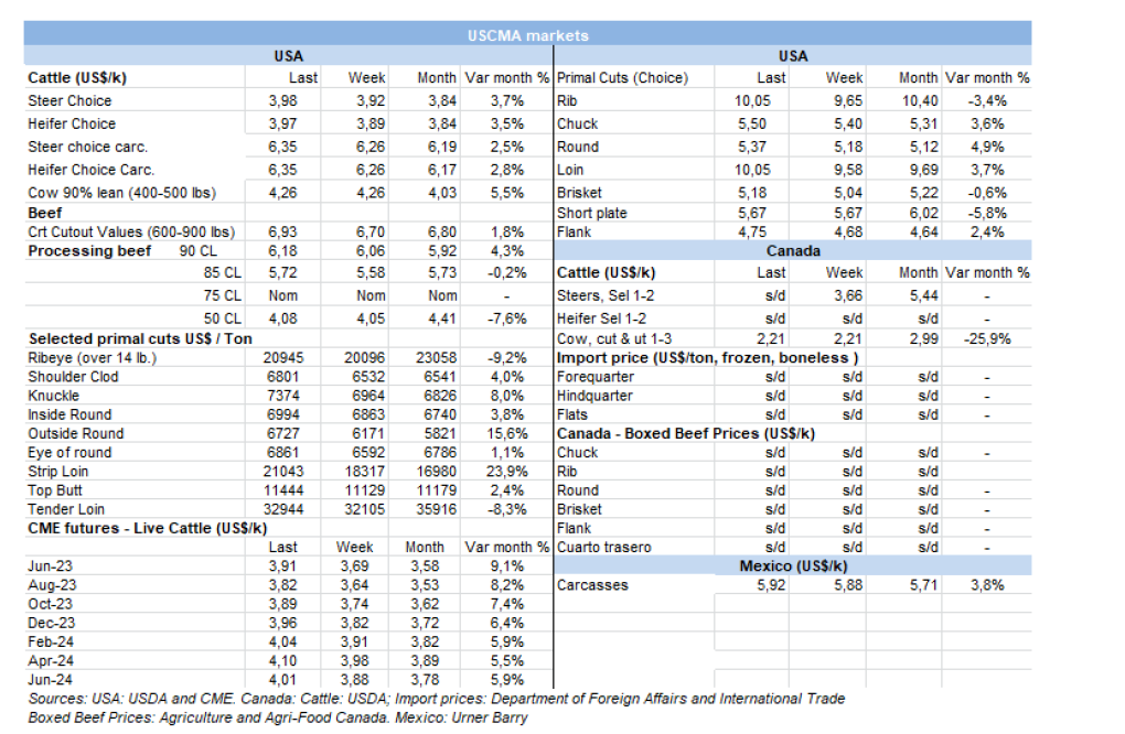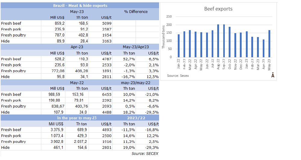 外貿(mào)部報(bào)告稱,5月巴西出口了168,510噸牛肉,出口額8.59億美元,均價(jià)為每噸$5099。由于往中國(guó)出口更加順暢,與4月份相比,數(shù)量增長(zhǎng)了53%(超過5.8萬(wàn)噸),均價(jià)回升了6.5%。是2022年10月以來(lái)最大出口量。