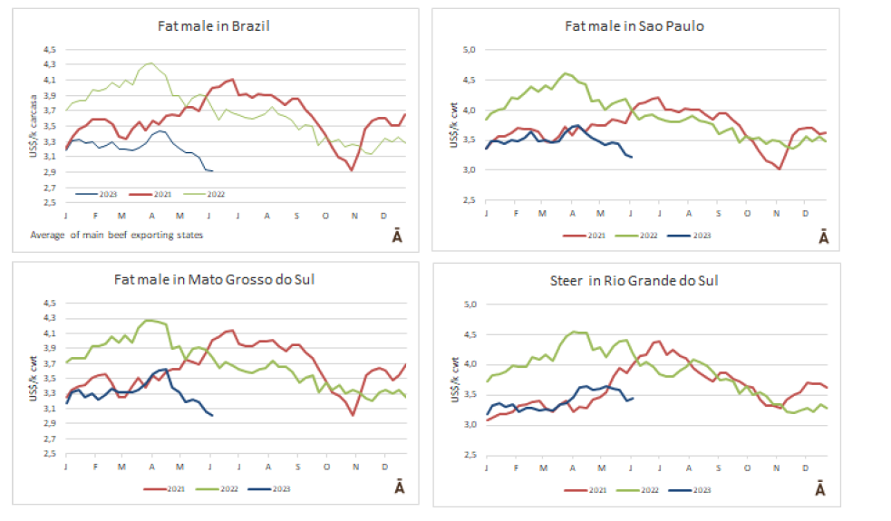巴西成品牛價(jià)格繼續(xù)大幅下跌,但雷亞爾的升值實(shí)際上抵消了下跌的幅度。在此背景下,本周南共市場(chǎng)閹公牛指數(shù)下跌了1%,至每公斤$3.33。巴西主要出口州的平均價(jià)格下跌1美分,至每公斤$2.91。巴西匯率升值2.8%,抵消了雷亞爾下跌3.2%的影響。