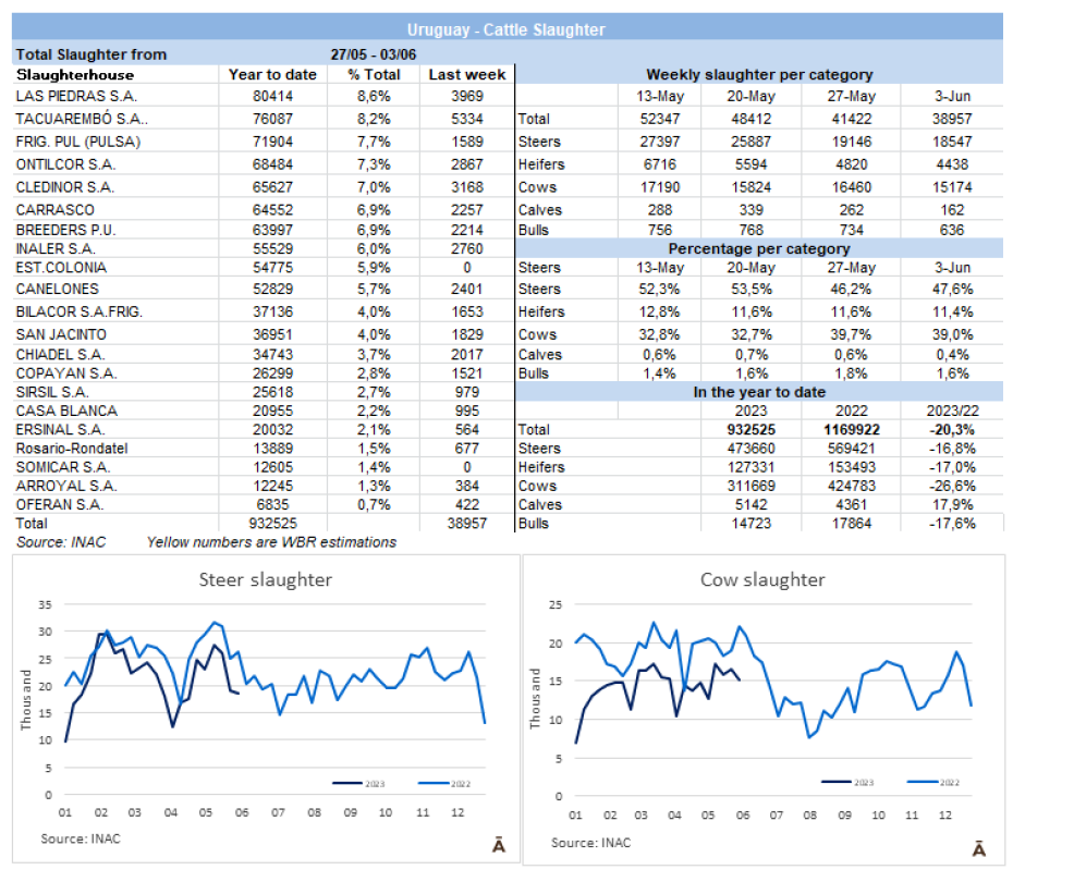 5月份,有206,164頭牛被屠宰,比2022年同月少了近42,000頭(-17%)。今年前五個(gè)月累計(jì)共屠宰了915,955頭牛,比2022年同期減少219,000頭(-19%)。