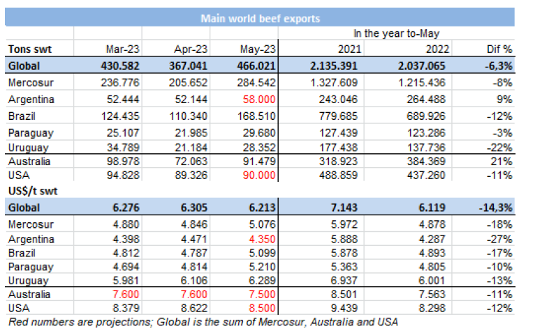 南方共同市場5月份向中國出口了約17.5萬噸牛肉,比4月份多出近8萬噸。反過來,來自大洋洲的出貨量為4萬噸,是三年來最高的月度貨運量,比4月份增加了6.5萬噸。