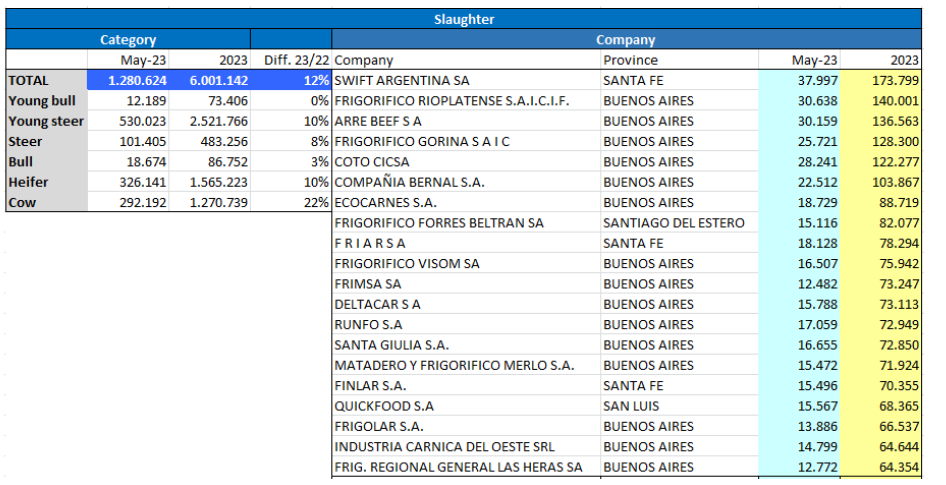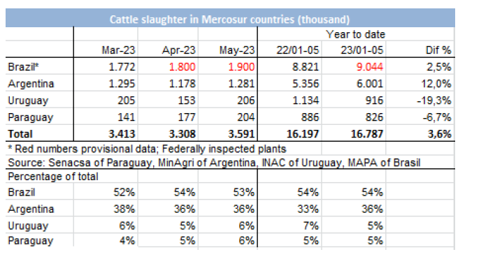 根據(jù)官方數(shù)據(jù)顯示5月份屠宰了128萬頭牛,比上個月增長了近9%,年度增長率略高于10%。按工作日計算,5月份的屠宰量超過去年4月份總量的3%,比2022年5月的屠宰量高出16%。雖然在這兩方面的比較中都有增長,特別是同比增長,但與上個月相比有所下降,當時日屠宰量在每月比較中增長11%,同比增長18%。在2023年的前五個月,牛的屠宰量超過了2022年同期。今年共有600萬頭牛被屠宰,比去年同期多12%。