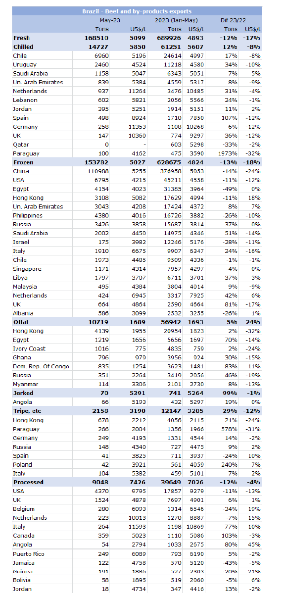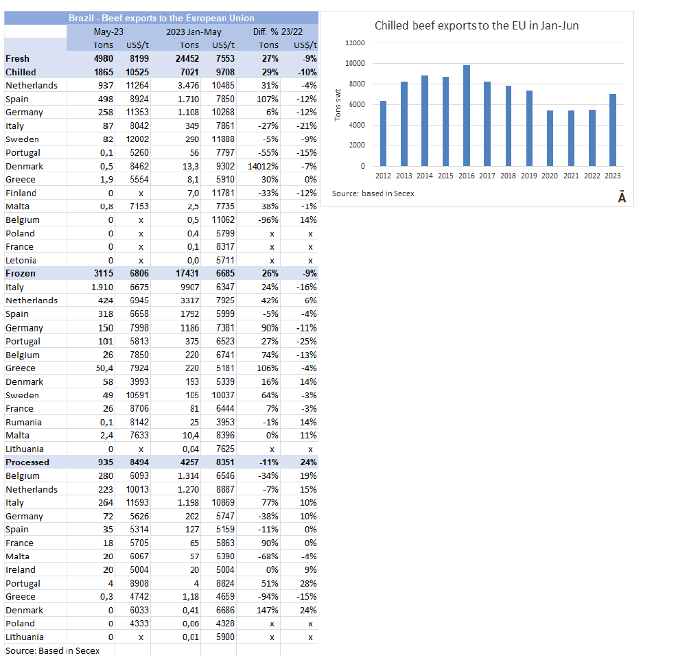 2023年以來巴西對歐盟的牛肉出口量大幅增加,這與國外總銷量的情況相反。在1-5月期間,巴西出口了24452噸鮮牛肉,比2022年同期多27%;冰鮮(增長29%)和冷凍(增長26%)的出口都有所增加。荷蘭在巴西鮮牛肉出口中占主導地位,其次是西班牙,而意大利在巴西冷凍牛肉出口中基本占主導地位,是總數(shù)量的57%。