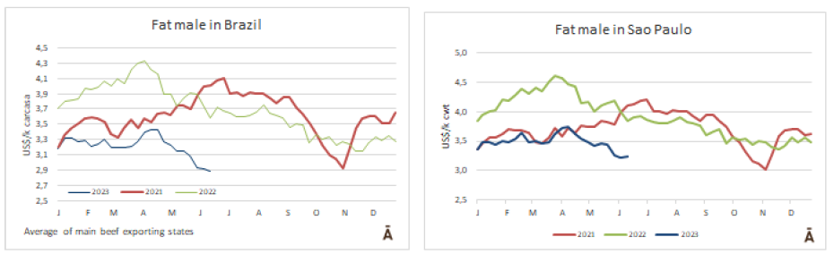 自4月初以來,主要出口州的成品牛價格下跌18%,從R$/@258下降到R$/@211。本周已經(jīng)是連續(xù)第十次下跌。