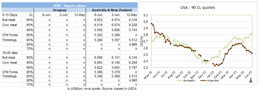 智利市場上周沒有出現(xiàn)太大波動。進口商繼續(xù)為7-8月的到貨做短線交易,在9月的國慶中迎來下一個消費旺季。一家進口商為巴西的19切出的到岸價$5600-$5700,為巴拉圭的19切出的到岸價$5800-$5900,而兩個供應商的9切前驅(qū)為$5100-$5200,80VL碎肉$3100-$3200。